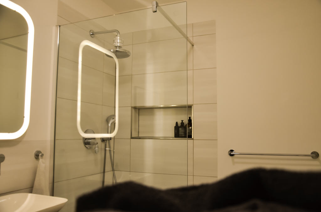 Angrenzend befindet sich ein kleines, aber optimal nutzbares Schlafzimmer. Das innenliegende Badezimmer verfügt über eine Dusche, einen Waschtisch sowie einen Waschmaschinenanschluss.