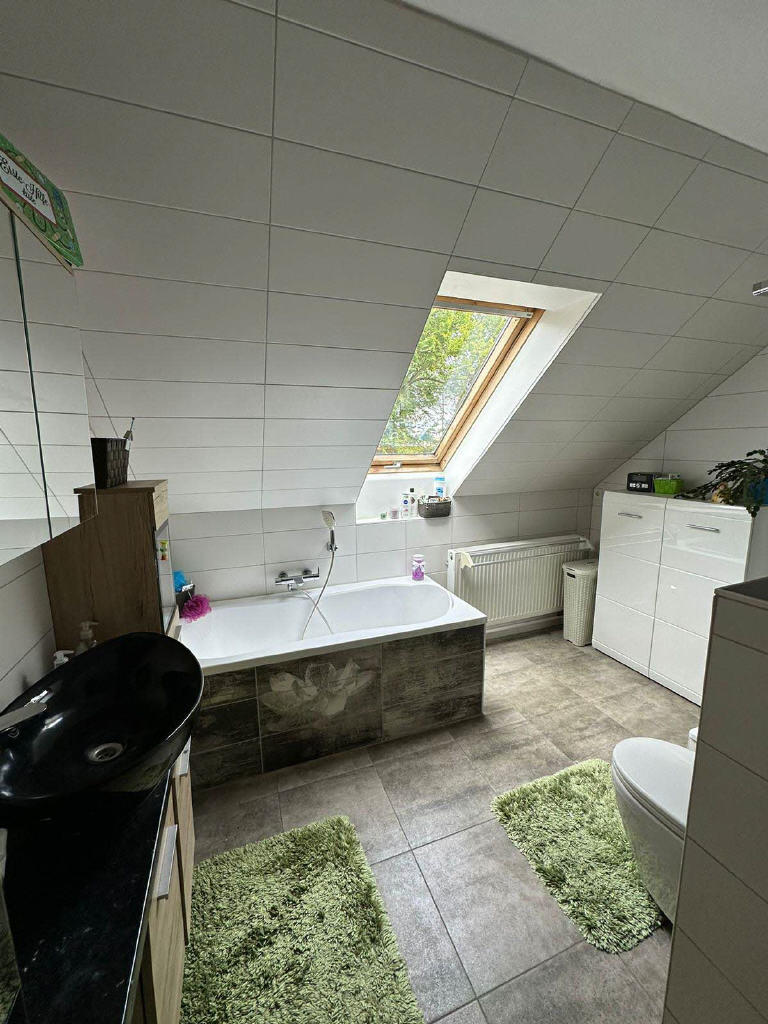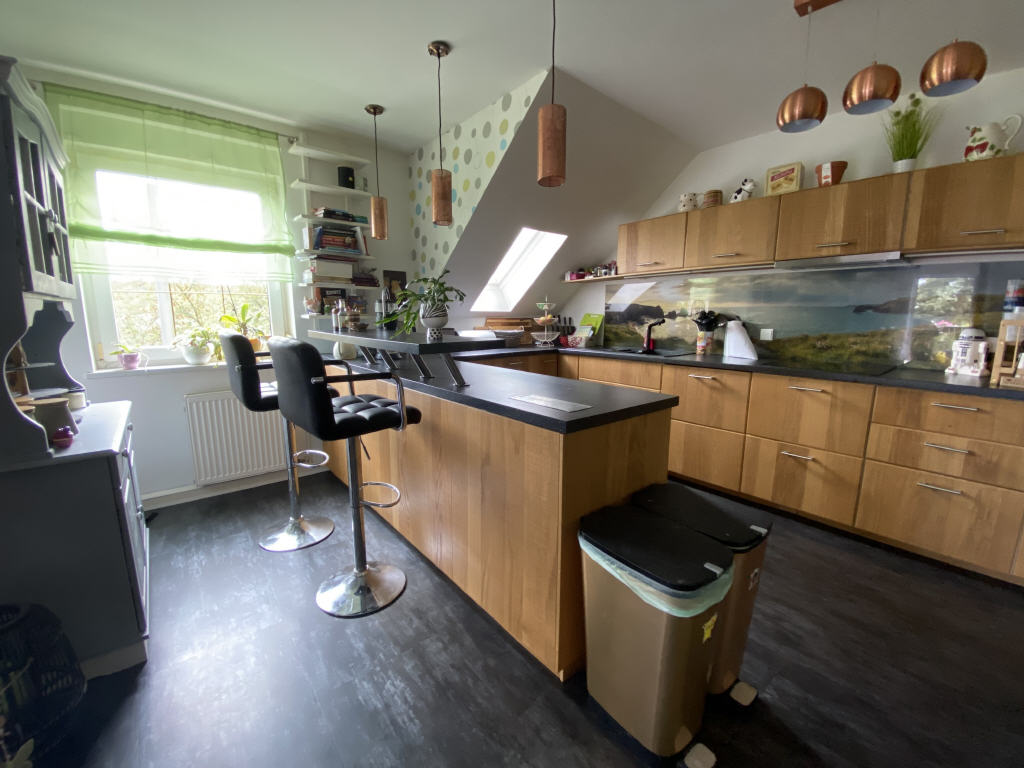 Die Hauptwohnung erstreckt sich über das Ober- und Dachgeschoss und bietet mit ca. 180 m² Wohnfläche und 7 Zimmern mehr als genug Platz für individuelle Gestaltung. Auf dem zusätzlichen Balkon, welcher vom Wohnzimmer aus erreichbar ist, kann man sich nicht nur die Morgensonne ins Gesicht scheinen lassen, man hat auch eine wunderbare Aussicht in den begrünten Garten. Die stilvolle Ausstattung in allen Bereichen dieser Wohnung sorgen für eine ansprechende Wohnatmosphäre.