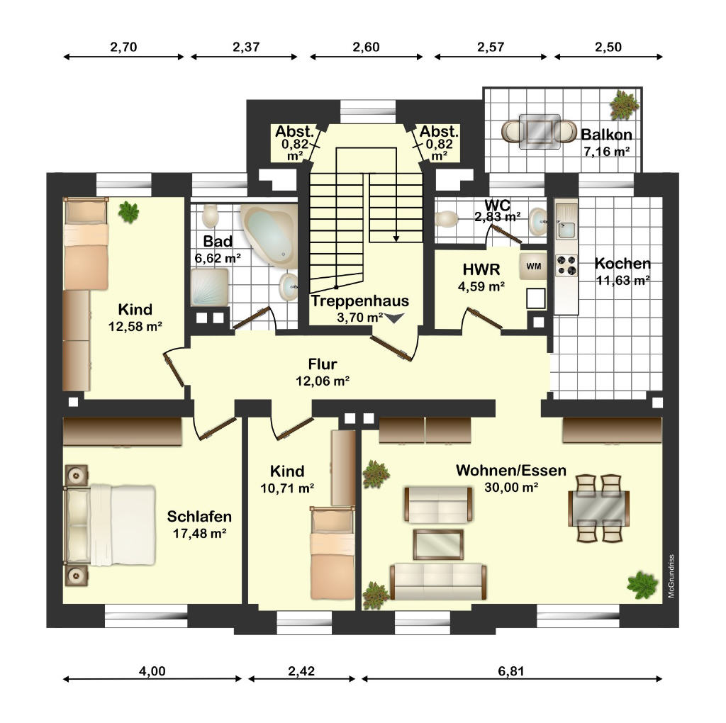 Die Wohnfläche der Wohnung im 2. Obergeschoss teilt sich in ein Wohn-, zwei Kinder- und ein Schlafzimmer, eine Küche mit Fenster, ein Badezimmer mit Wanne und WC sowie einen Flur auf. Die Einheit ist mit einem Gäste-WC und einem kleinen Hauswirtschaftsraum ausgestattet. Der Balkon zum großen Innenhof bietet Platz für sonnige Stunden. Des weiteren gehören zwei Abstellräume im Treppenhaus und einer im Kellergeschoss zum Objekt.