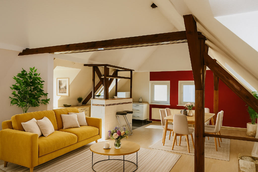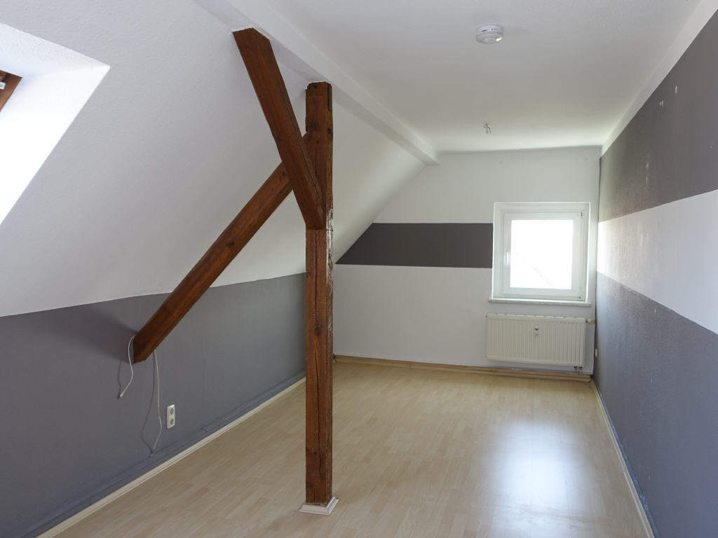 Die angebotene 3-Raumwohnung bietet eine familienfreundliche Wohnfläche von ca. 95 m² und ist mit einem Balkon versehen. Sichtbare Balken und vorhandene Dachschrägen verleihen der Wohnung eine behagliche Atmosphäre. Die Wohnung verfügt über ein großzügiges Wohnzimmer mit offenem Küchenbereich. Die Übernahme der vorhandenen einzelnen, freistehenden Küchenmöbel inkl. Herd, Spülmaschine und Kühlschrank ist kostenfrei möglich. Weiterhin ist ein Zwischenboden, für zusätzlichen Stauraum oder als kleine Galeriefläche nutzbar, integriert. Das hell geflieste Tageslichtbad ist mit einer Badewanne ausgestattet. Schlaf- und Kinderzimmer ergänzen das moderne Raumangebot. Zusätzlich steht dem Mieter ein Kellerabteil zur Verfügung.